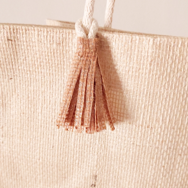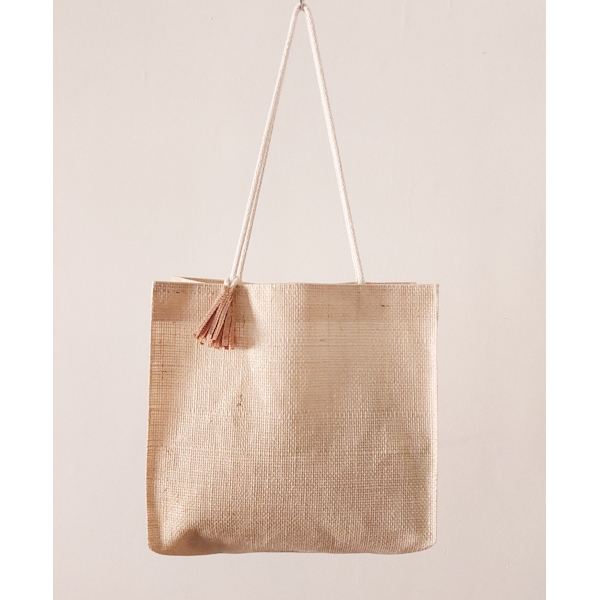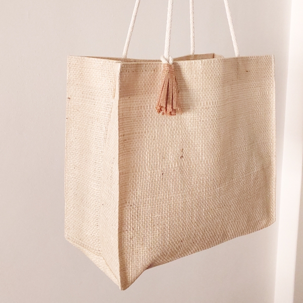 Confeccionada en tela de arpillera engomada. Asa de cordón de algodón.