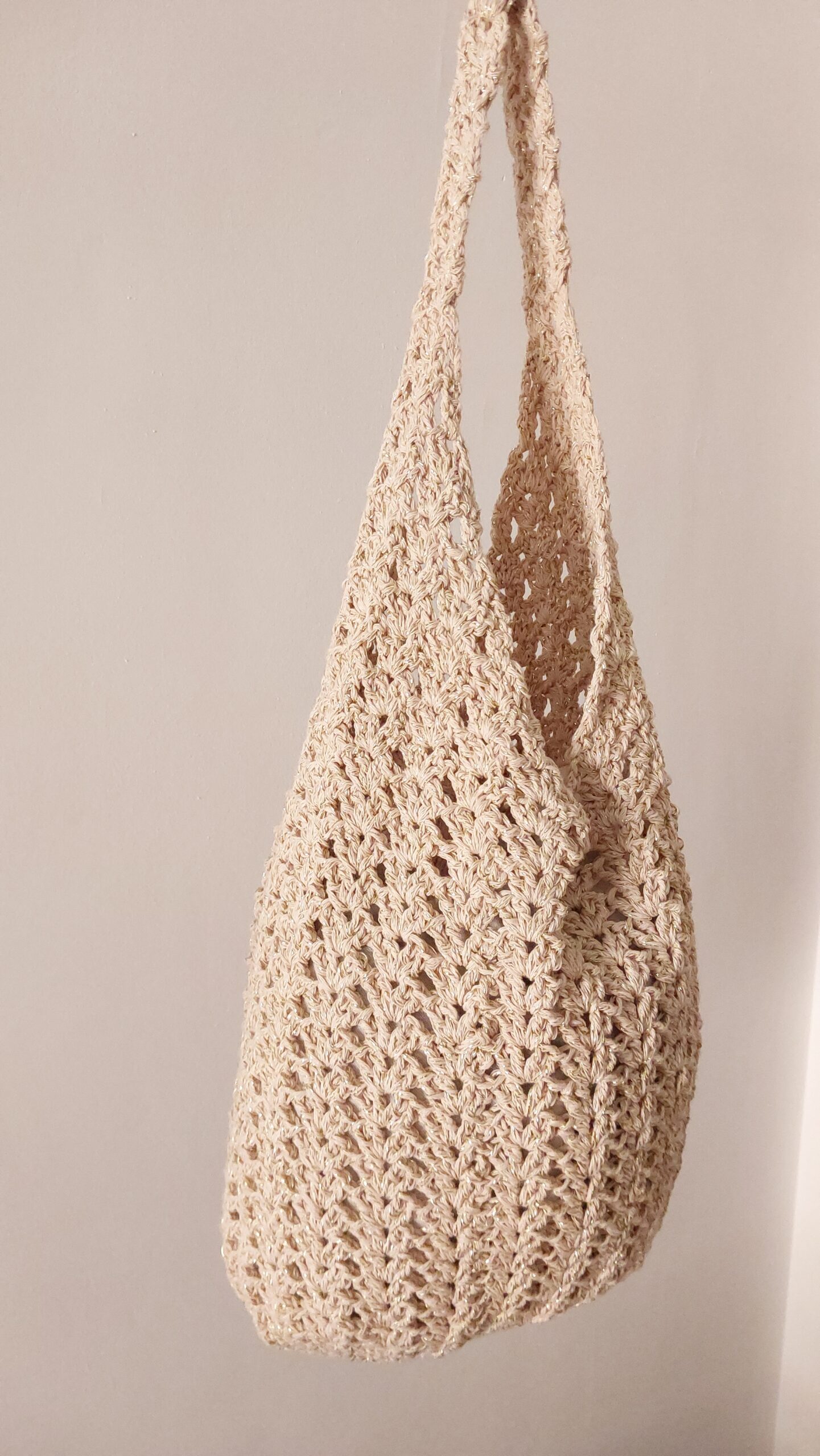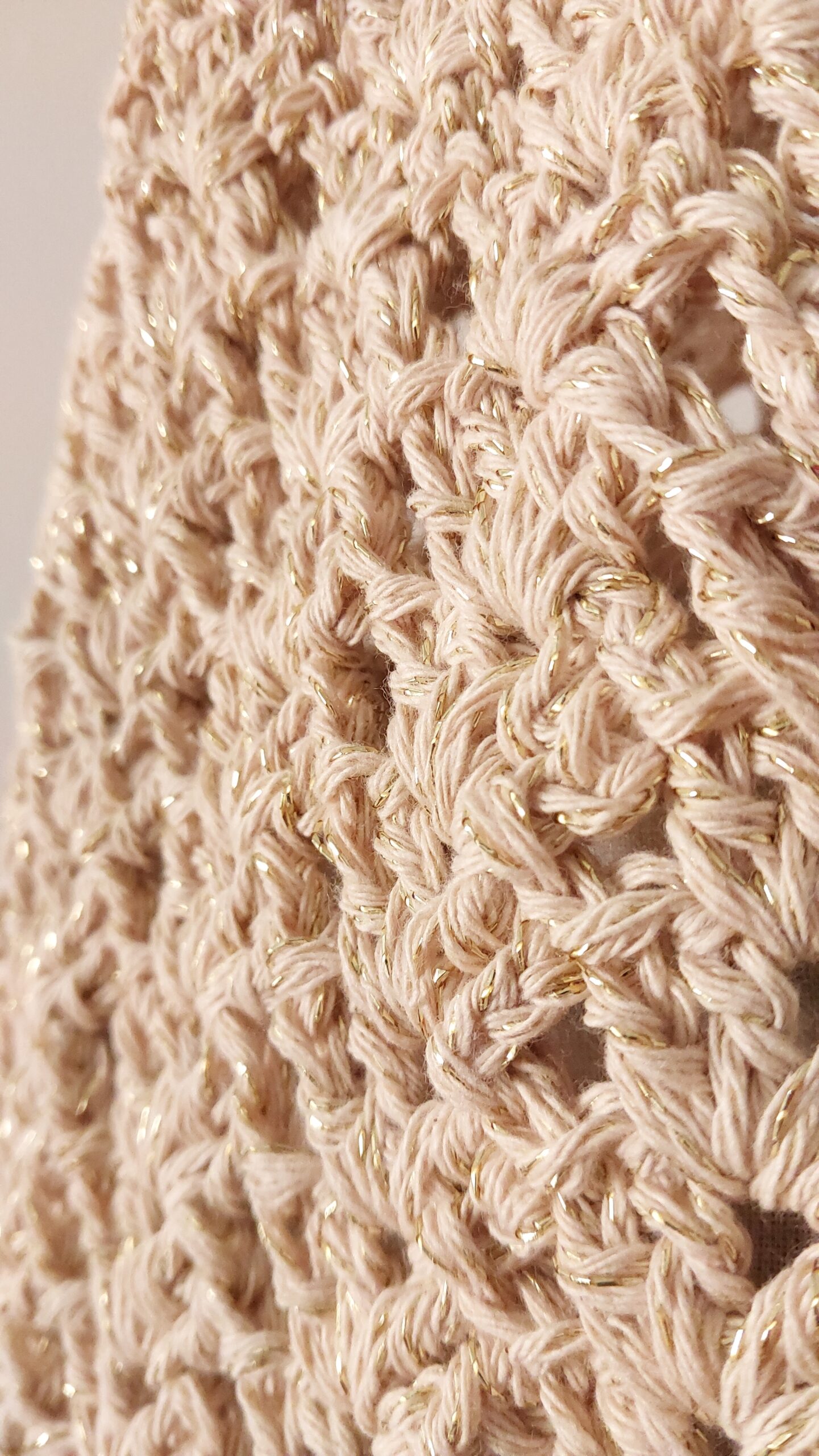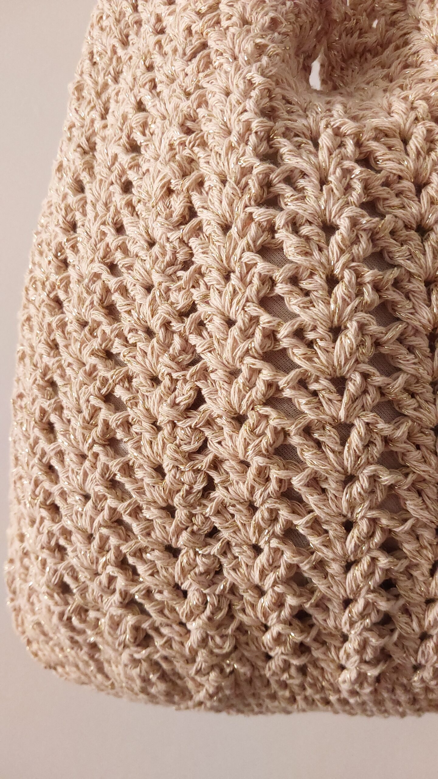 Tejido a crochet en hilo de algodón con lúrex. Interior de lienzo con bolsillo.