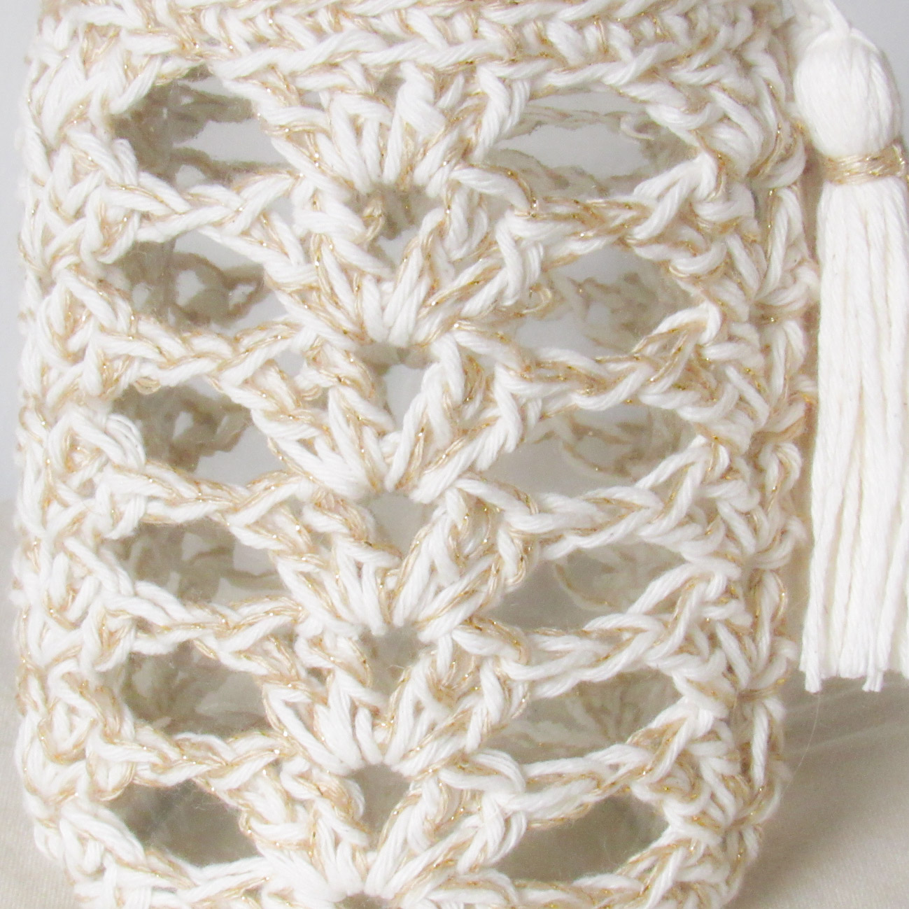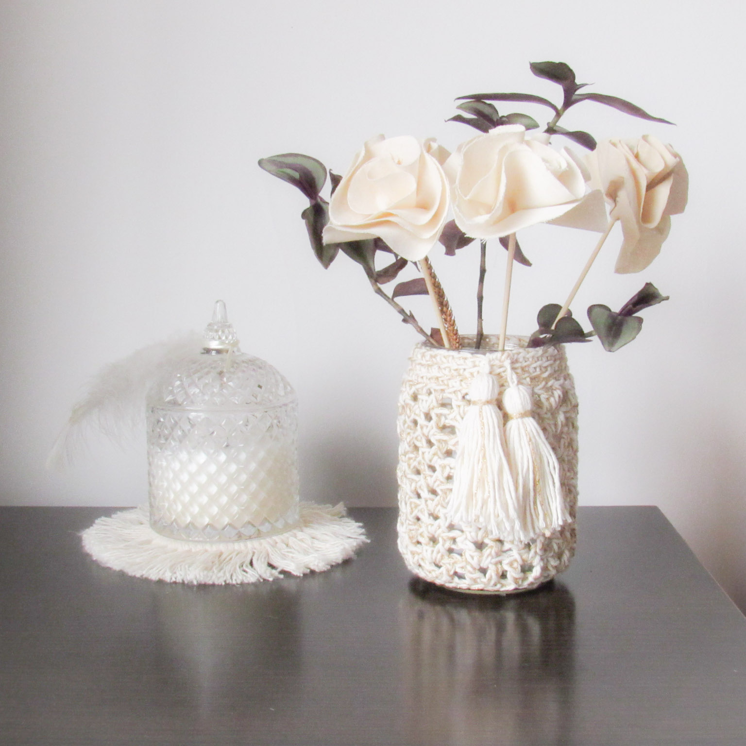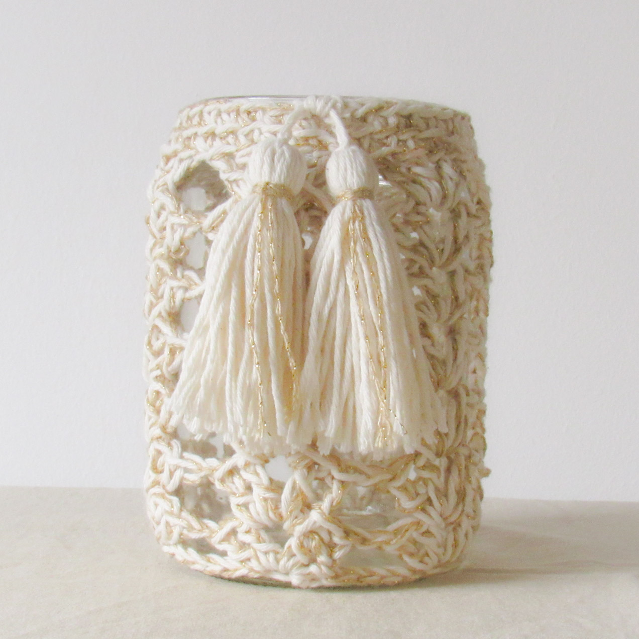 Frasco de vidrio con tejido de hilo de algodón color natural